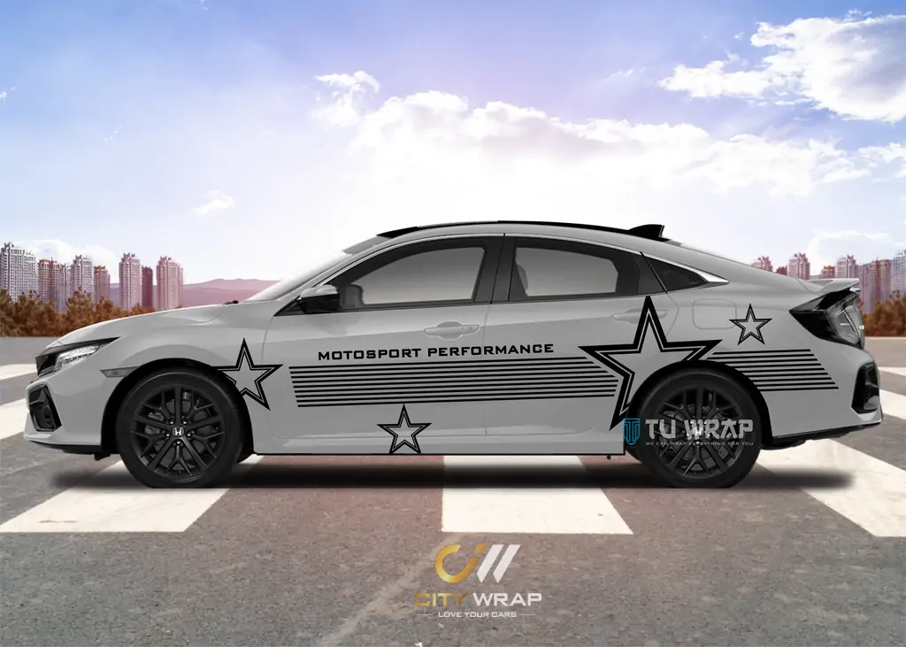Mẫu tem xe ô tô Honda thiết kế bởi CityWrap với phong cách trẻ trung, năng động. Phù hợp chủ xe thích đơn giản và phóng khoáng cùng trải nghiệm tốc độ vốn có chiếc xe Honda